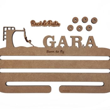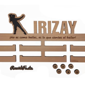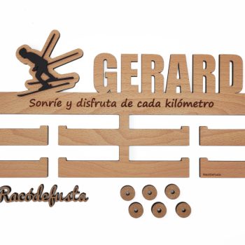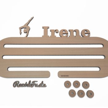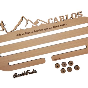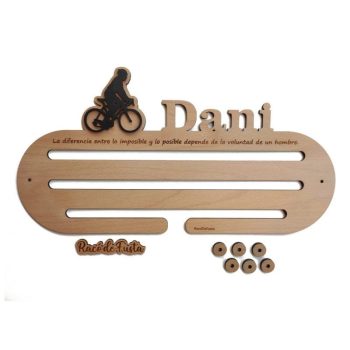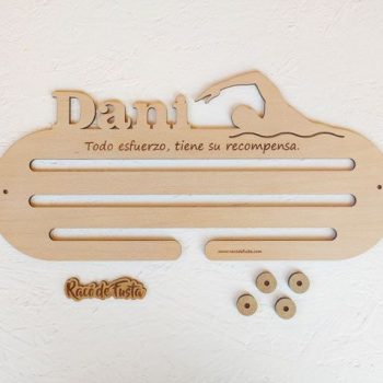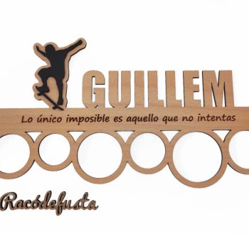 Porta medalles de fusta personalitzats amb el teu nom, silueta del esport i gravat amb una frase motivadora.