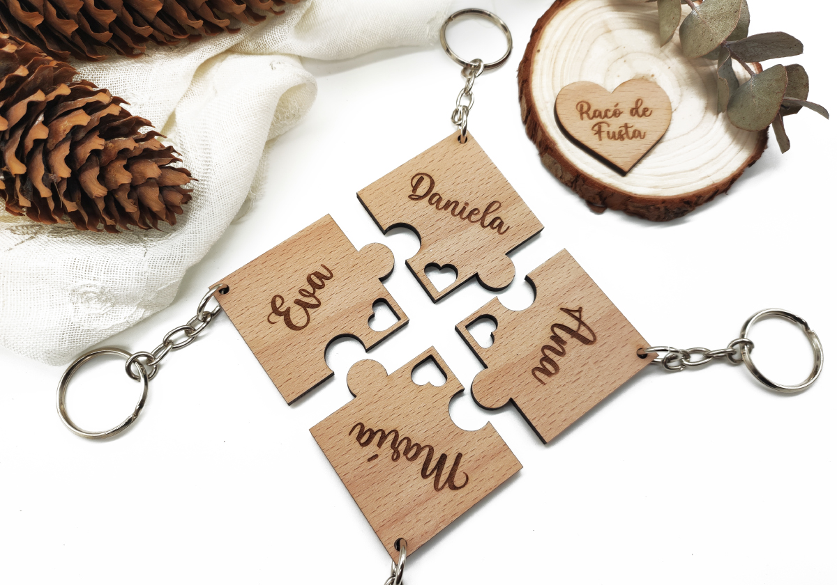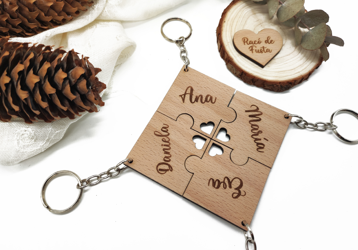 Conjunt de 4 clauers de fusta de faig personalitzats i gravats a làser.