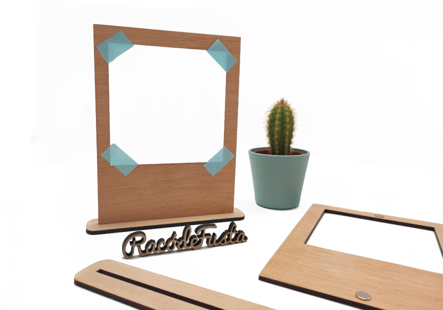 Pot incloure 2 imants en la part posterior del marc de fotos o base de fusta per a col·locar en una superfície.