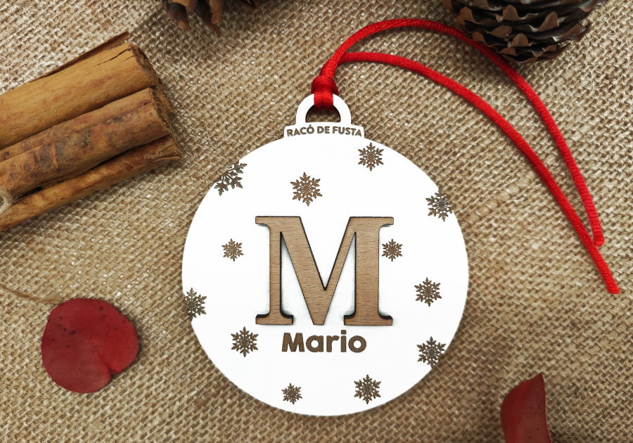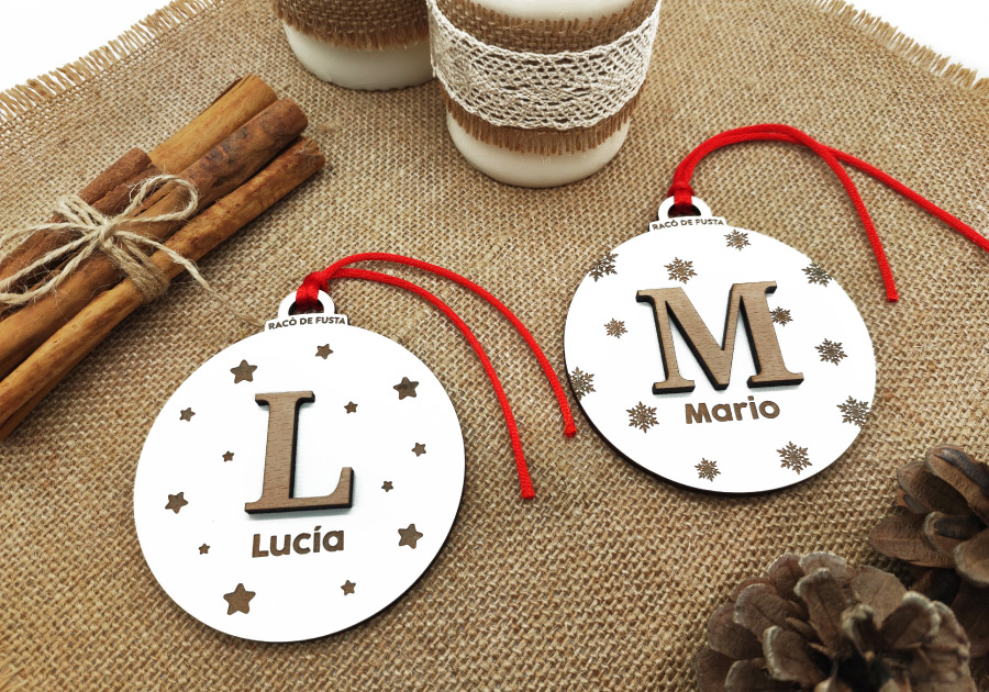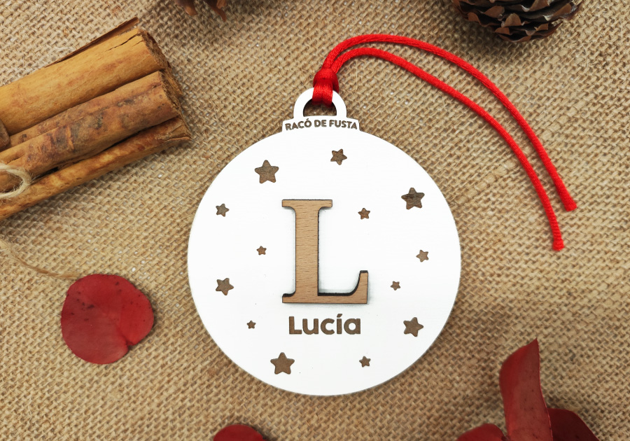La inicial del nombre va colocada en relieve, en madera laminada de haya, las estrellas, los copos de nieve y el nombre grabados a láser.