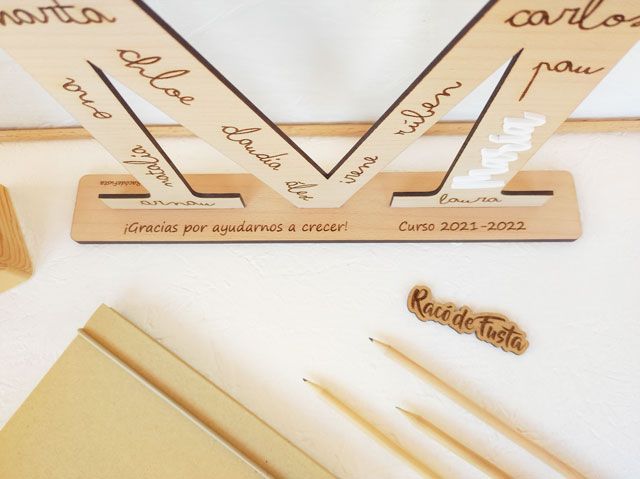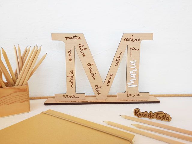 Letra inicial de madera de haya con nombre del profe en metacrilato y los nombres de todos los alumnos de la clase grabados a láser.