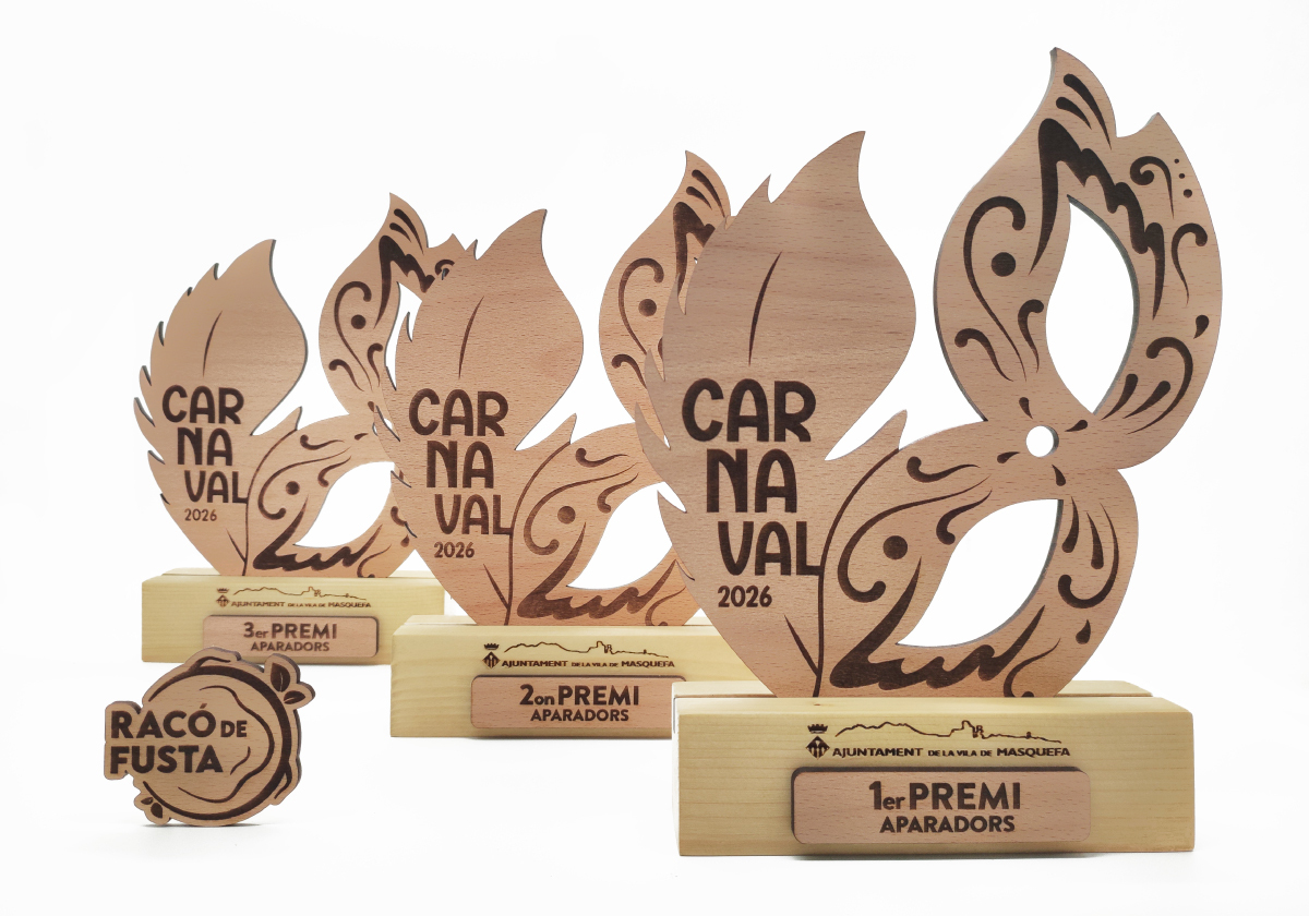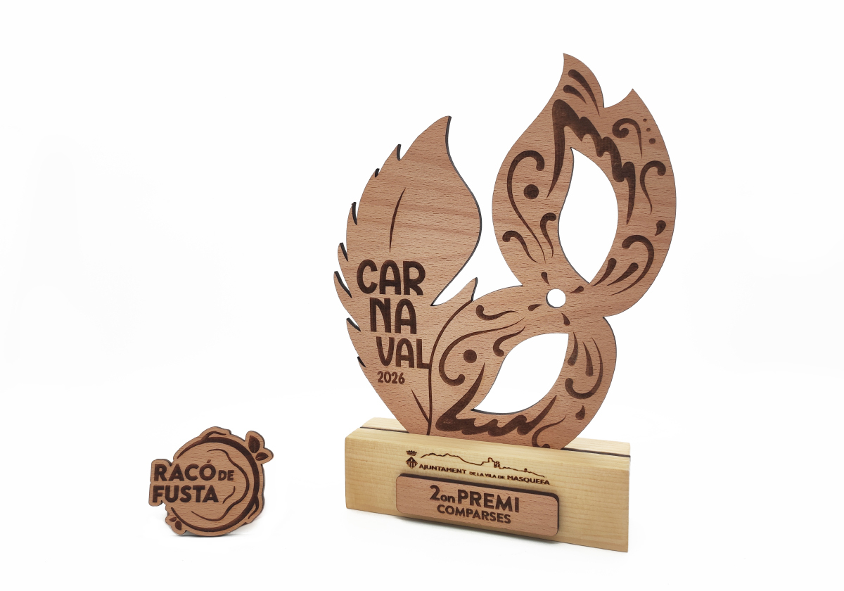 El trofeo está realizado en madera laminada de haya con diseño personalizado con una preciosa mascara y pluma grabada a láser.
